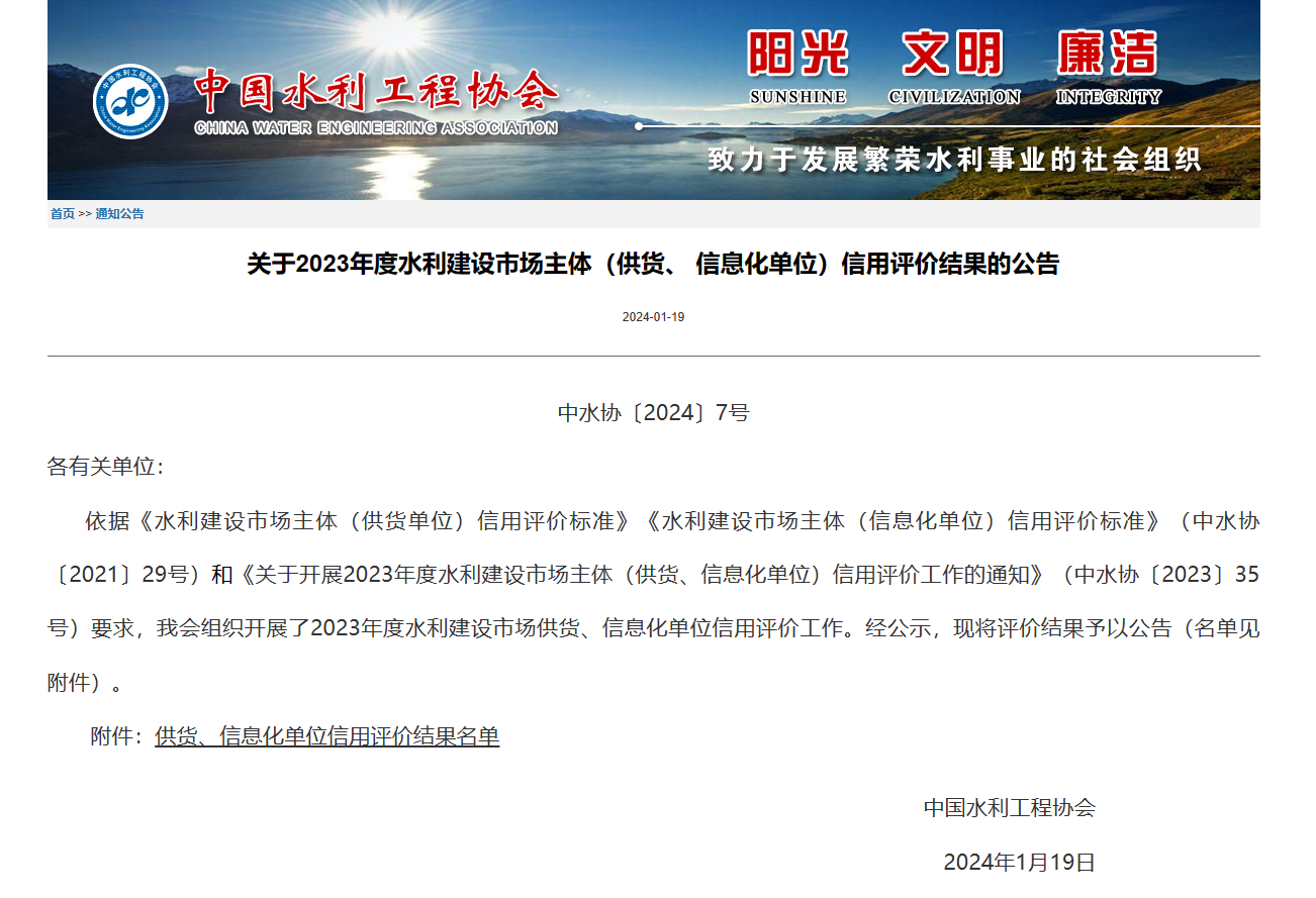 近日,中國水利工程協會發布了《關于2023年度水利建設市場主體信用評價結果的公示》,正泰中自榮獲2023年度水利建設市場主體信用評價AAA級 供貨、信息化單位 評定!