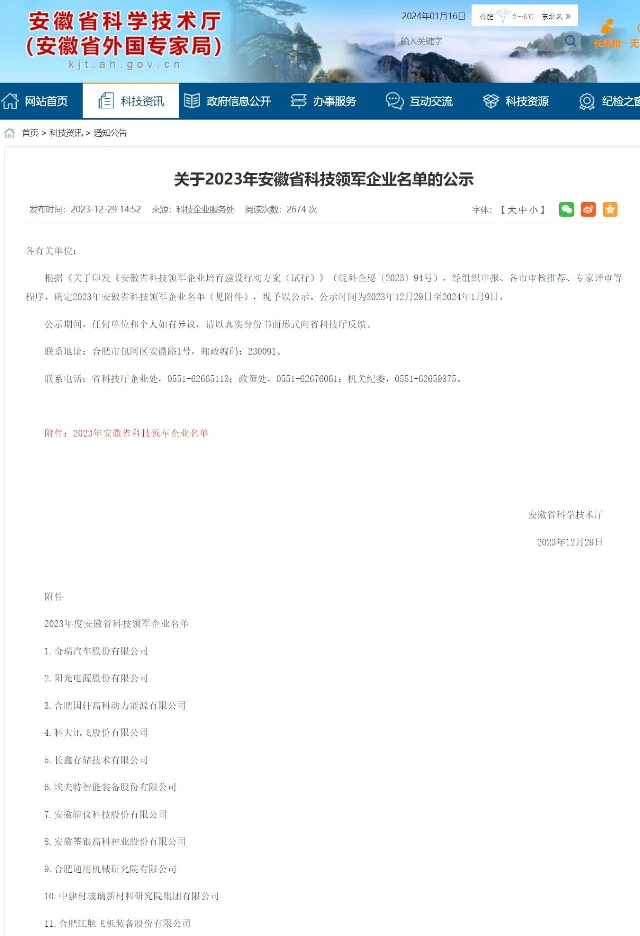 該名單根據《關于印發〈安徽省科技領軍企業培育建設行動方案(試行)〉(皖科企秘〔2023〕94號)》(下稱《方案》),經組織申報、各市審核推薦、專家評審等程序,最終得以確定。