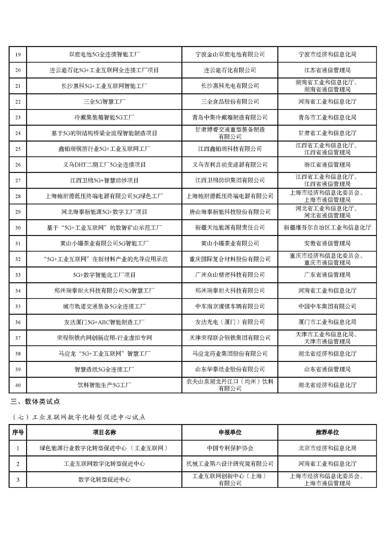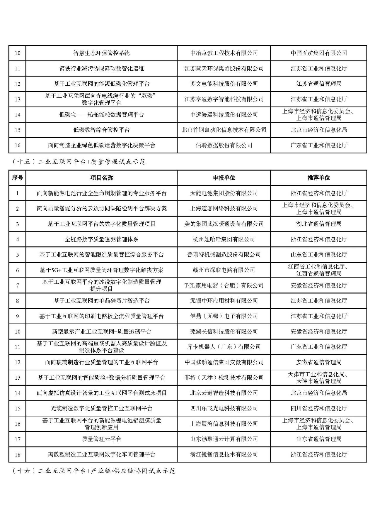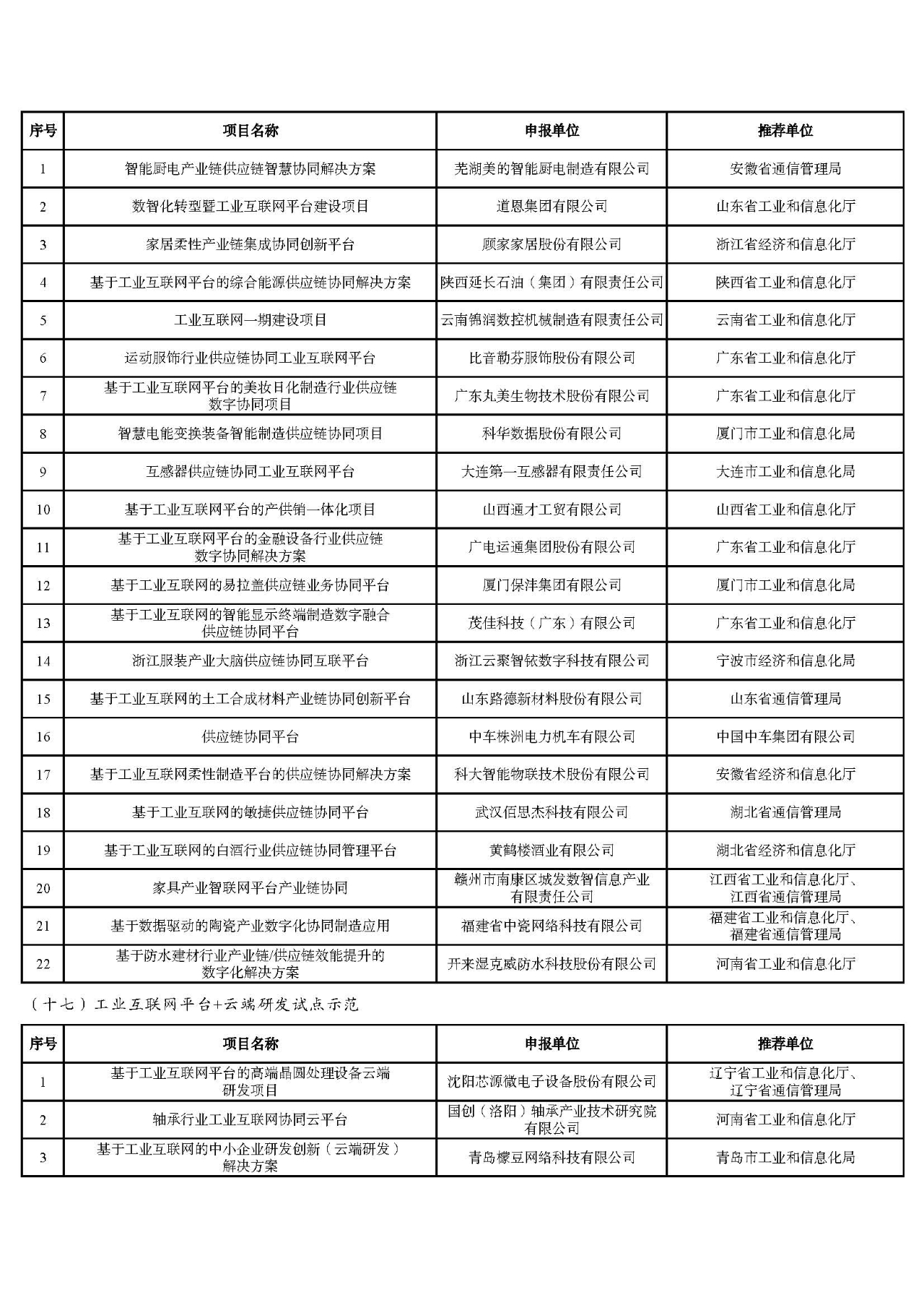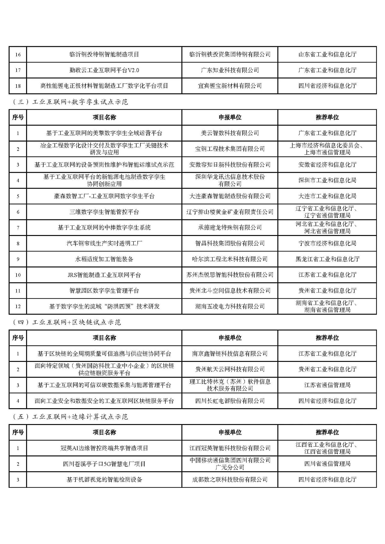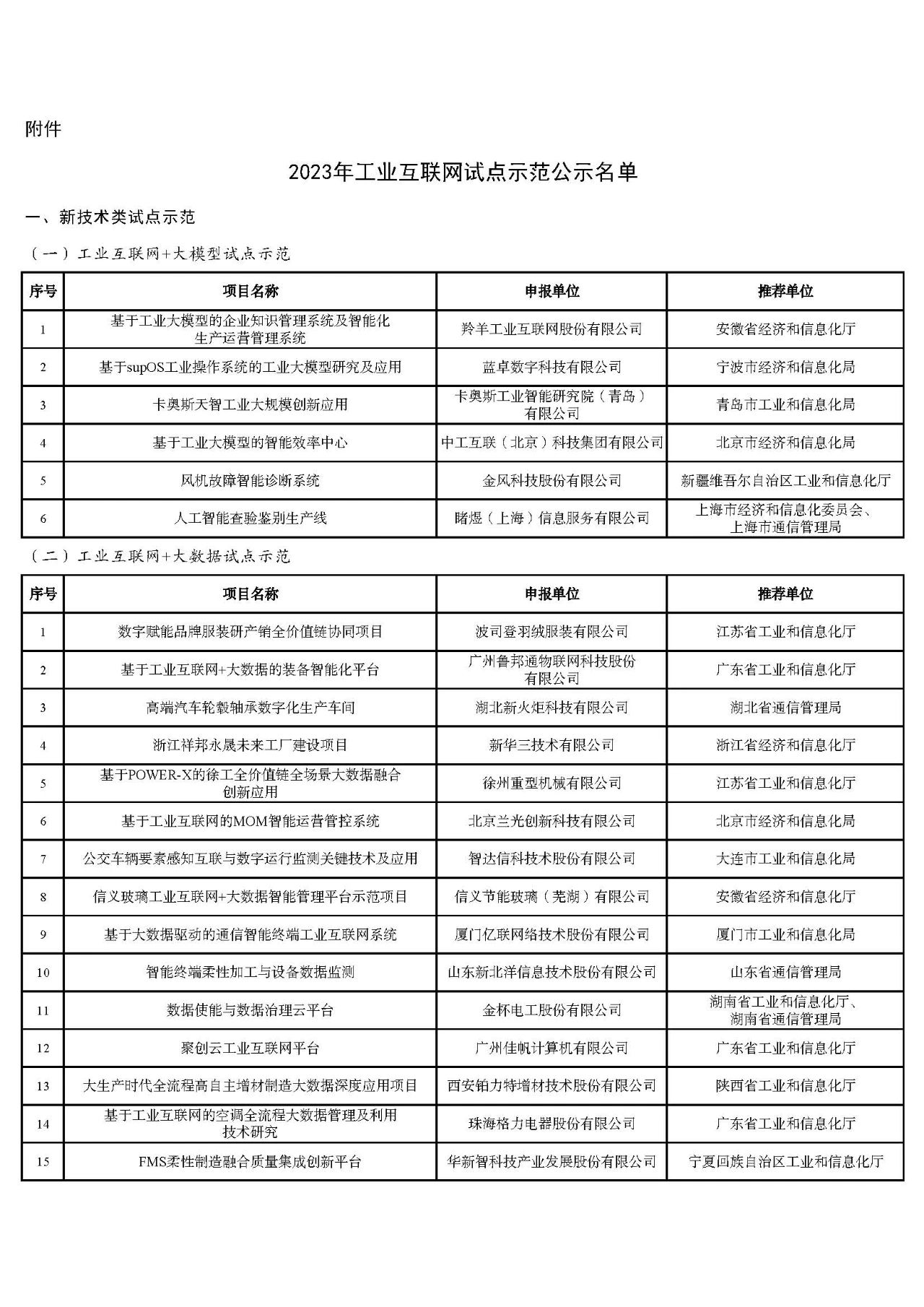 為深入貫徹《國務院關于深化“互聯網+先進制造業”發展工業互聯網的指導意見》,根據《工業和信息化部辦公廳關于組織開展2023年工業互聯網試點示范項目申報工作的通知》(工信廳信管函﹝2023﹞319號),經企業申報、地方推薦、專家評審,形成2023年工業互聯網試點示范名單。現予以公示,歡迎社會各界監督。如有異議,請在公示期內與我們聯系。