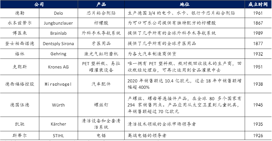 表:部分德國(guó)中小企業(yè)已成為細(xì)分領(lǐng)域巨頭或唯一供應(yīng)商