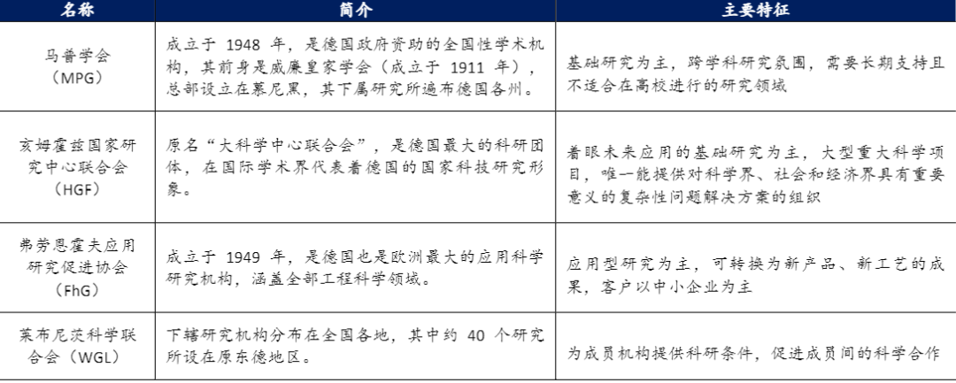 除弗勞恩霍夫協(xié)會(huì)外,德國(guó)還有馬普學(xué)會(huì)、亥姆霍茲國(guó)家研究中心聯(lián)合會(huì)和萊布尼茨科學(xué)聯(lián)合會(huì)三大國(guó)家科研組織,分別在基礎(chǔ)研究、未來(lái)應(yīng)用研究、促進(jìn)研究機(jī)構(gòu)間的科學(xué)溝通等領(lǐng)域發(fā)揮作用。四大骨干科研組織為戰(zhàn)后德國(guó)工業(yè)的發(fā)展起到了重要的支撐作用。