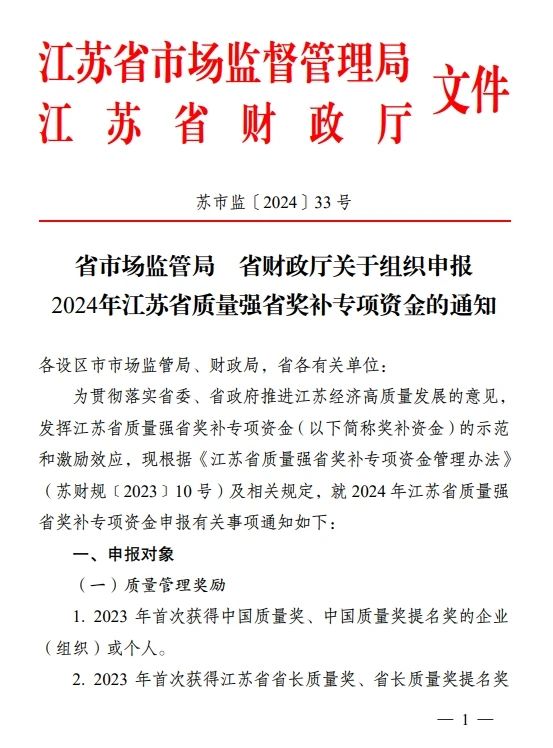 江蘇省市場(chǎng)監(jiān)管局、江蘇省財(cái)政廳發(fā)布關(guān)于組織申報(bào)2024年江蘇省質(zhì)量強(qiáng)省獎(jiǎng)補(bǔ)專項(xiàng)資金的通知,申報(bào)對(duì)象包括2023年首次通過能源管理體系認(rèn)證或節(jié)能產(chǎn)品認(rèn)證或低碳產(chǎn)品認(rèn)證或綠色產(chǎn)品認(rèn)證,且經(jīng)省市場(chǎng)監(jiān)管局考核評(píng)估為優(yōu)秀的企業(yè)。詳情如下: