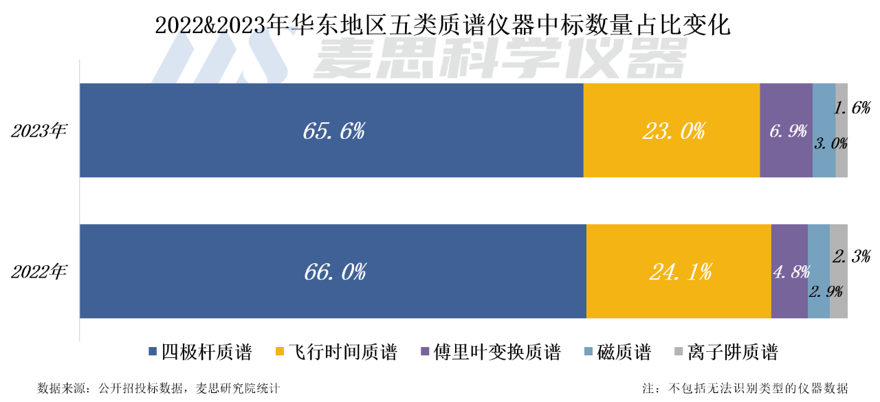 從各技術(shù)路線看,2023年華東地區(qū)四極桿質(zhì)譜中標(biāo)數(shù)量最多,占比65.6%,與2022年持平。飛行時(shí)間質(zhì)譜排名第二,中標(biāo)數(shù)量占比為23.0%,同比減少1.1個(gè)百分點(diǎn)。傅里葉變換質(zhì)譜的占比為6.9%,排名第三,同比增加2.1個(gè)百分點(diǎn)。