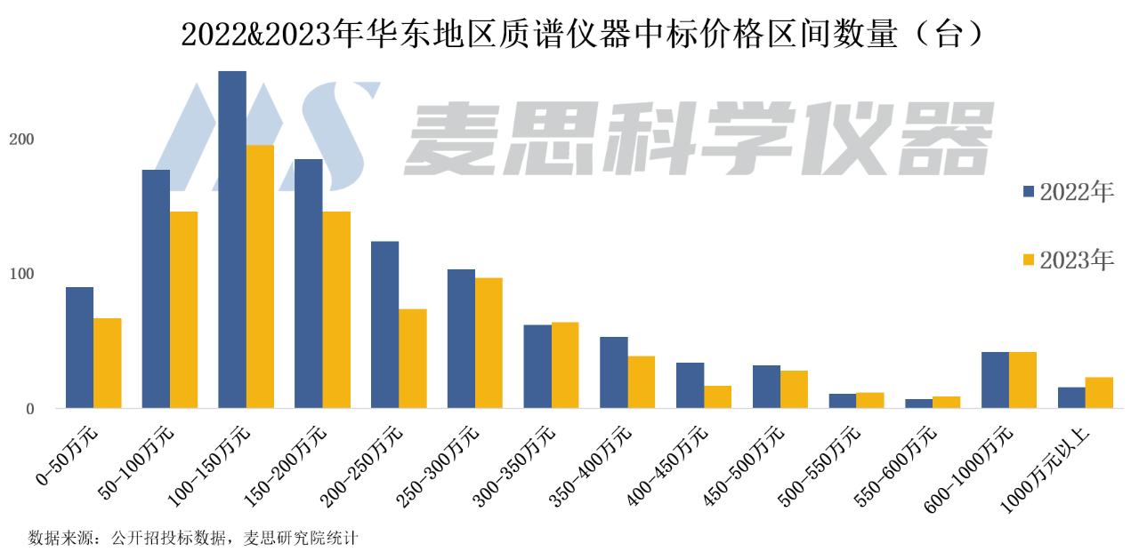 從各價(jià)格區(qū)間的中標(biāo)數(shù)量來(lái)看,華東地區(qū)質(zhì)譜儀器中標(biāo)單價(jià)主要集中在350萬(wàn)元以內(nèi),占比超80%。其中,中標(biāo)單價(jià)在100-150萬(wàn)元以內(nèi)的質(zhì)譜儀器數(shù)量最多,2023年中標(biāo)數(shù)量占比為20%;其次為50-100萬(wàn)元以及150-200萬(wàn)元的質(zhì)譜儀,占比均為15%。