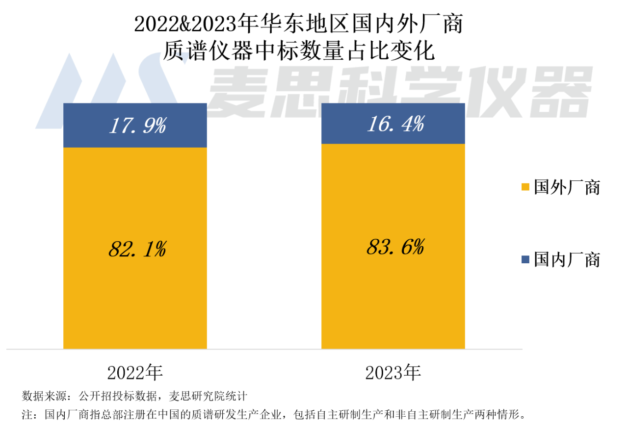 2023年華東地區(qū)國(guó)內(nèi)廠商中標(biāo)數(shù)量占比為16.4%,同比下降1.5個(gè)百分點(diǎn)。國(guó)外廠商中標(biāo)數(shù)量占比為83.6%,高于全國(guó)市場(chǎng)平均值(76%),占據(jù)市場(chǎng)主導(dǎo)地位。從二者占比變化可見(jiàn),2023年國(guó)內(nèi)廠商的質(zhì)譜儀器中標(biāo)數(shù)量下降幅度高于國(guó)外廠商。