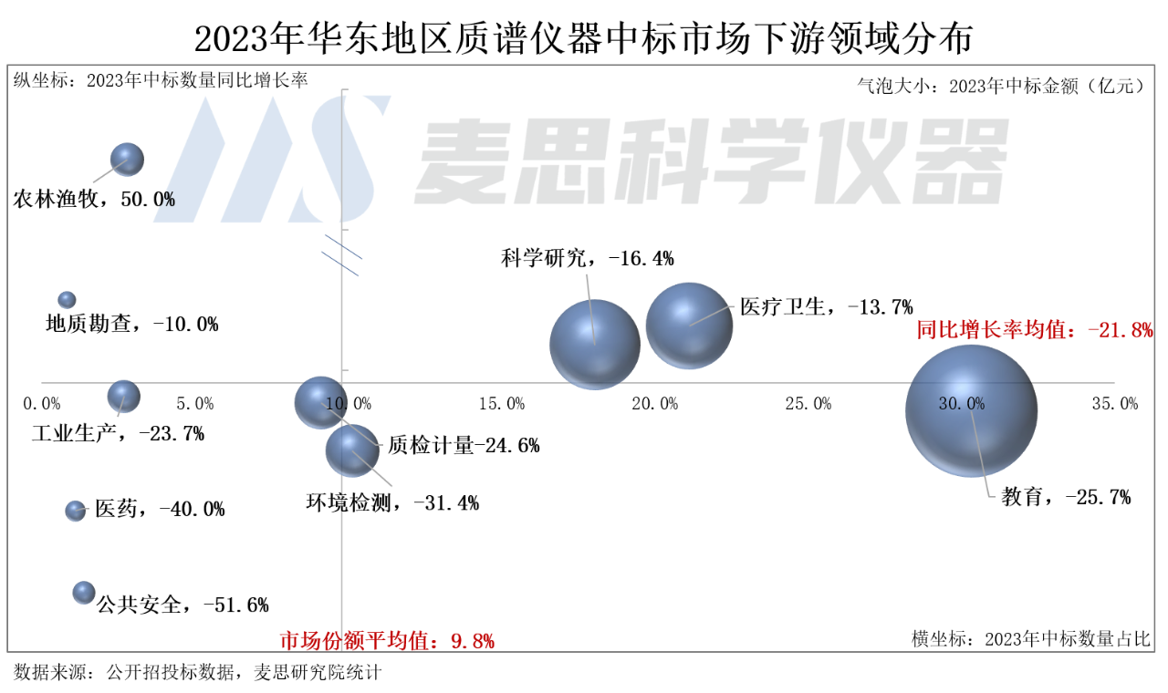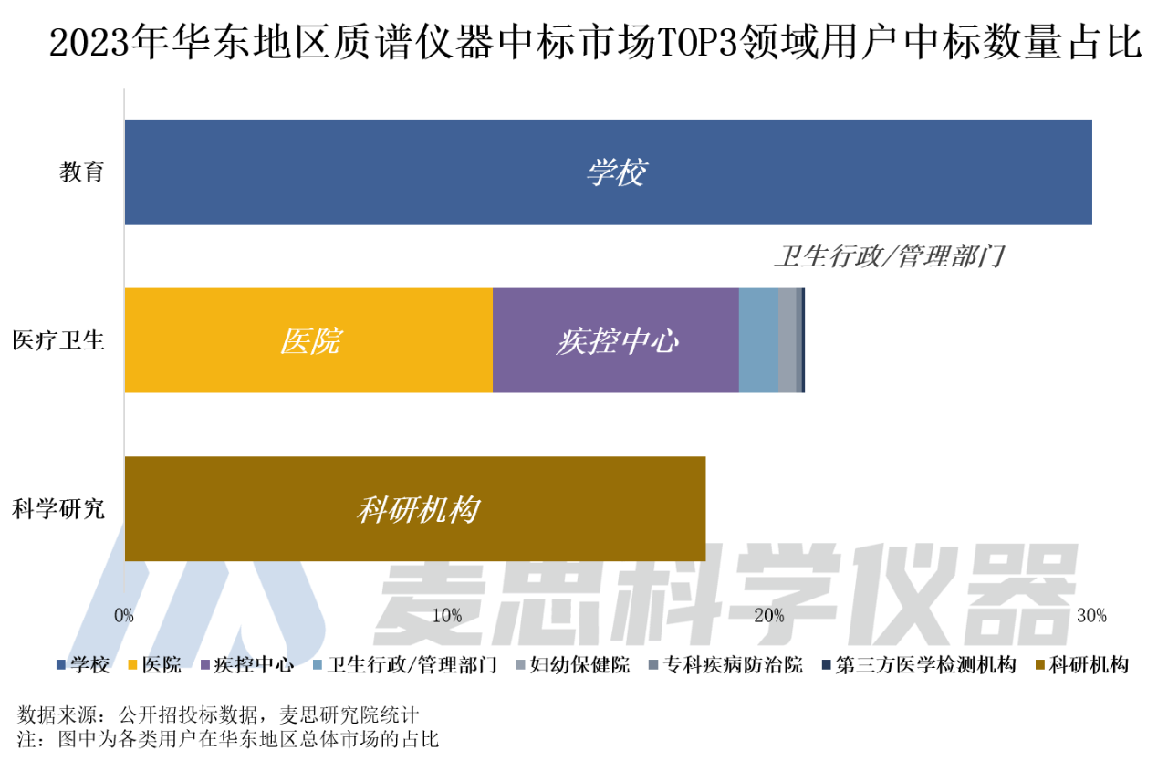 科學(xué)研究領(lǐng)域的用戶為科研機(jī)構(gòu),2023年中標(biāo)數(shù)量占比接近20%,是當(dāng)前華東地區(qū)質(zhì)譜儀器中標(biāo)市場(chǎng)的第二大采購(gòu)群體。