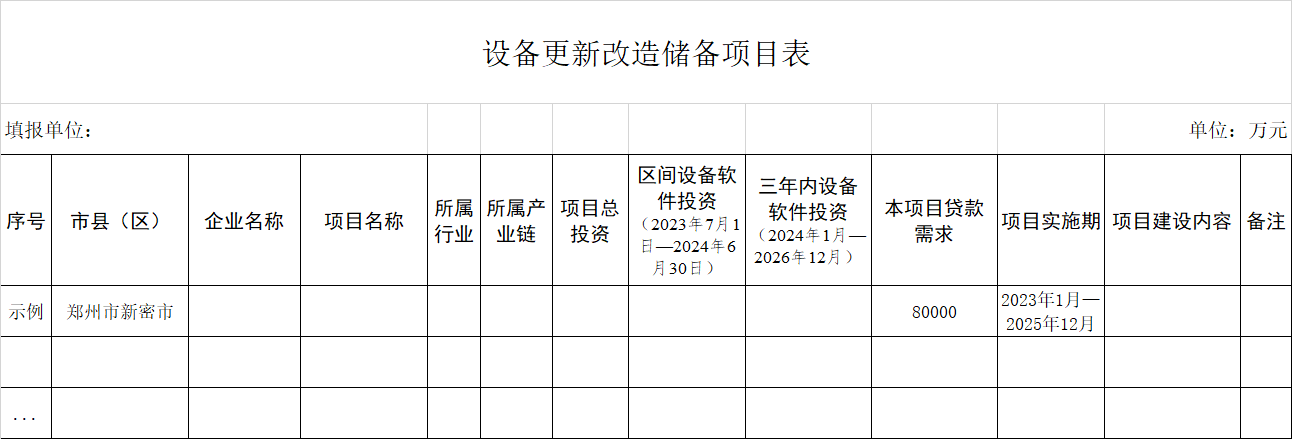 經(jīng)研究,河南省現(xiàn)開展制造業(yè)領(lǐng)域設(shè)備更新改造項(xiàng)目摸排,要求各地組織企業(yè)填報(bào)《設(shè)備更新改造儲(chǔ)備項(xiàng)目表》。