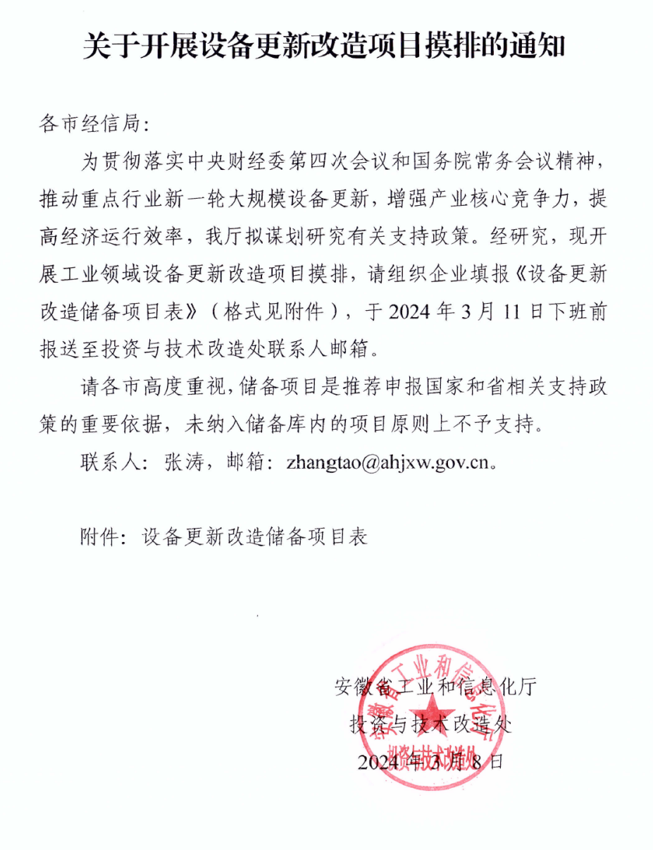 3月8日,安徽省工信廳投資與技術(shù)改造處發(fā)布《關(guān)于開展設(shè)備更新改造項(xiàng)目摸排的通知》。為貫徹落實(shí)中央財(cái)經(jīng)委第四次會(huì)議和國(guó)務(wù)院常務(wù)會(huì)議精神,推動(dòng)重點(diǎn)行業(yè)新一輪大規(guī)模設(shè)備更新,增強(qiáng)產(chǎn)業(yè)核心競(jìng)爭(zhēng)力,提高經(jīng)濟(jì)運(yùn)行效率,安徽省工信廳擬謀劃研究有關(guān)支持政策。