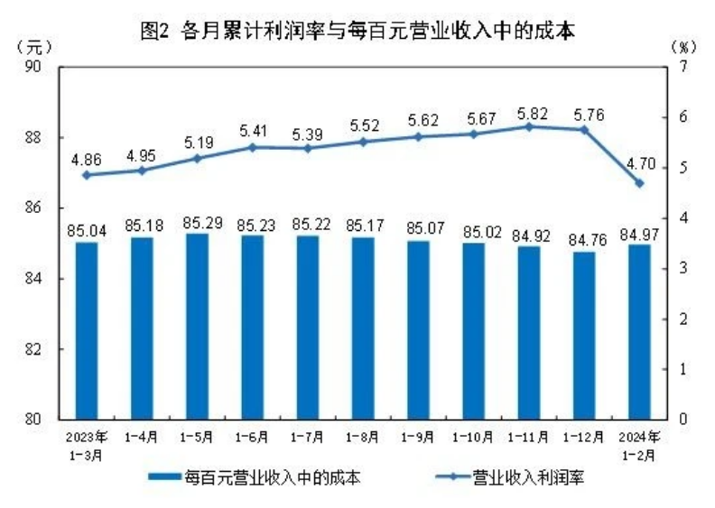 1—2月份,規(guī)模以上工業(yè)企業(yè)每百元營(yíng)業(yè)收入中的成本為84.97元,同比增加0.11元;每百元營(yíng)業(yè)收入中的費(fèi)用為8.62元,同比減少0.01元。
