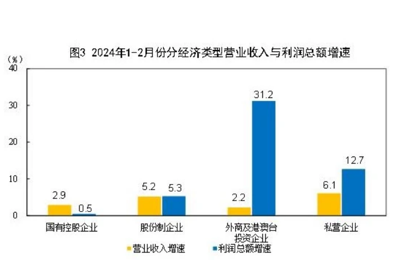 1—2月份,規(guī)模以上工業(yè)企業(yè)中,國(guó)有控股企業(yè)實(shí)現(xiàn)利潤(rùn)總額3434.9億元,同比增長(zhǎng)0.5%;股份制企業(yè)實(shí)現(xiàn)利潤(rùn)總額6898.5億元,增長(zhǎng)5.3%;外商及港澳臺(tái)投資企業(yè)實(shí)現(xiàn)利潤(rùn)總額2169.2億元,增長(zhǎng)31.2%;私營(yíng)企業(yè)實(shí)現(xiàn)利潤(rùn)總額2465.4億元,增長(zhǎng)12.7%。