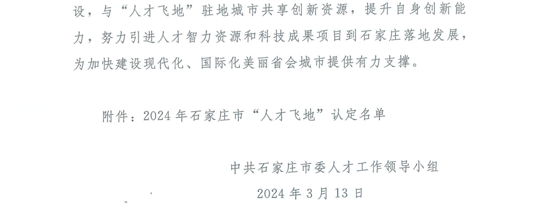 近日,中共石家莊市委人才工作領(lǐng)導(dǎo)小組對(duì)2024年度石家莊市“人才飛地”認(rèn)定結(jié)果進(jìn)行通報(bào),北京生態(tài)中潤(rùn)科技有限公司作為先河環(huán)保北京研發(fā)中心載體,正式被認(rèn)定為石家莊市“人才飛地”稱號(hào)。
