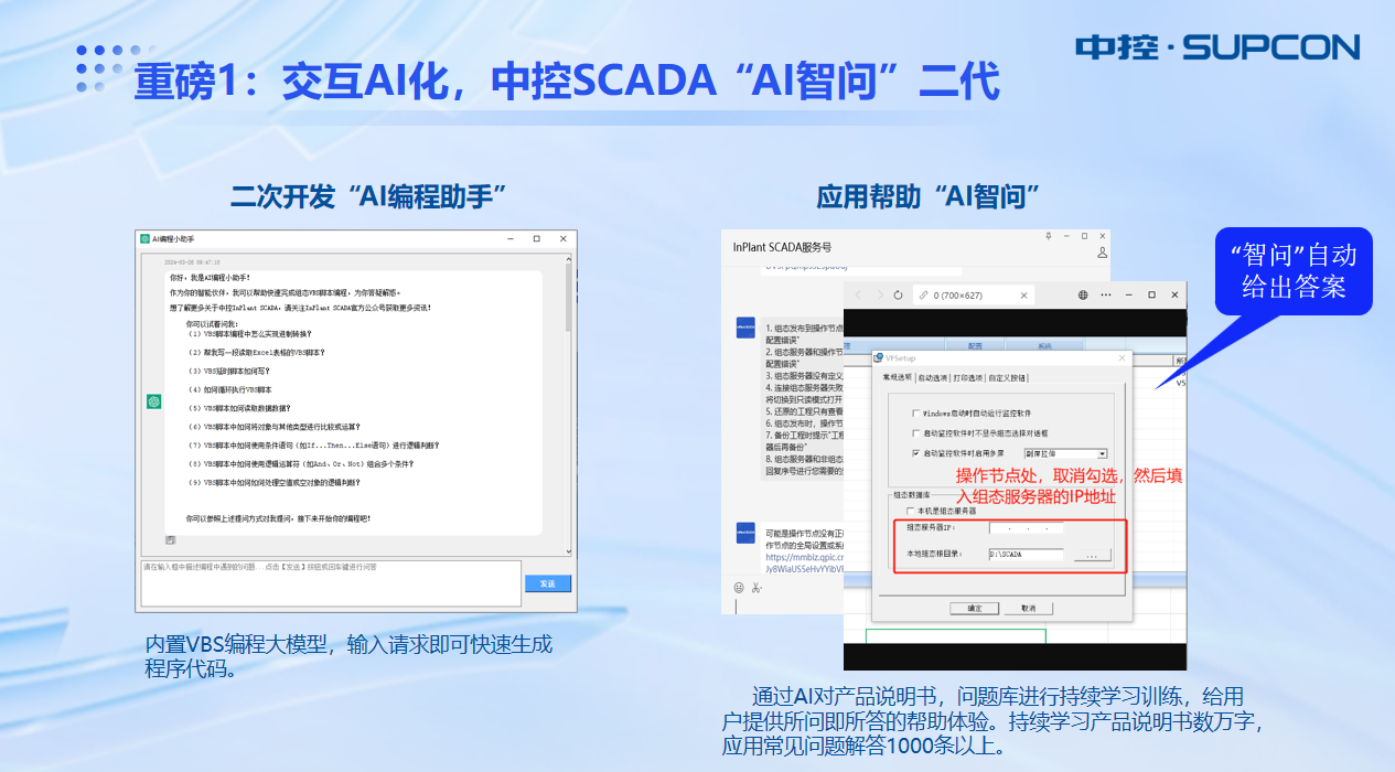 中控SCADA 6.5版本新增“AI編程助手”和“AI智問”兩種功能。“AI編程助手”內置VBS編程大模型,輸入請求即可快速生成程序代碼,能夠幫助用戶進行軟件功能的二次開發。“AI智問”經過大量訓練,已深入學習海量產品說明書及應用問題,能夠為用戶實時提供工程問題解答和指導,降低了人工答疑的時間損耗,實現工程搭建的效率提升。