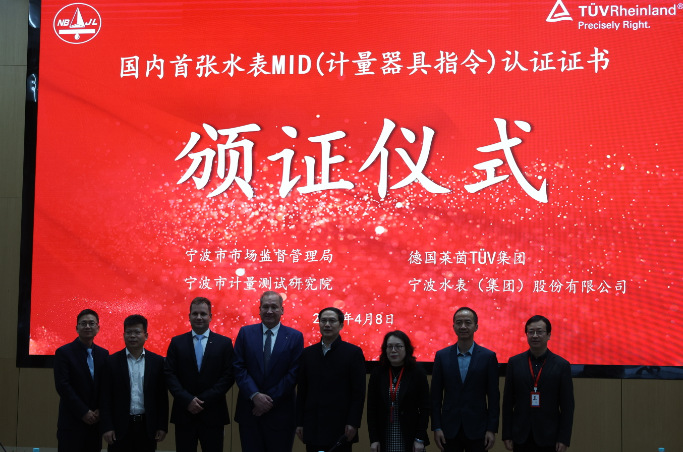 近日,寧波水表科技(集團(tuán))股份有限公司在國家水表產(chǎn)品質(zhì)量檢驗(yàn)檢測中心(寧波中心)通過德國萊茵TUV認(rèn)證公司認(rèn)證,獲得國內(nèi)頒發(fā)的首張MID認(rèn)證證書。