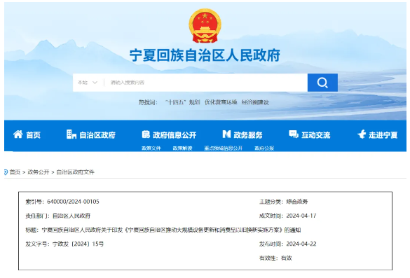 寧夏回族自治區人民政府關于印發《寧夏回族自治區推動大規模設備更新和消費品以舊換新實施方案》的通知
