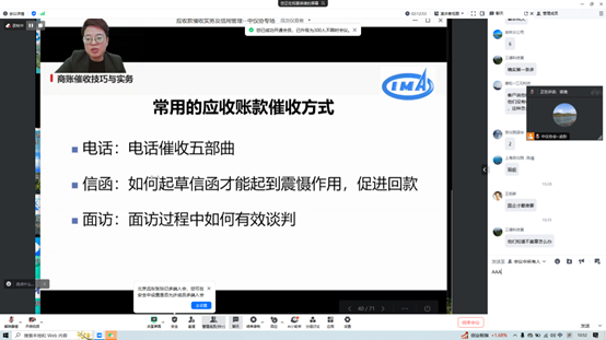 授課直播間氛圍熱烈,學(xué)員與授課老師頻頻互動交流,咨詢在業(yè)務(wù)開展中實際糾紛的化解策略。授課老師針對賬款催收中訴訟手段和非訴訟手段的適用場景進行細致解答。學(xué)員紛紛表示,培訓(xùn)內(nèi)容切中企業(yè)痛點,突出應(yīng)收賬款催收技巧實效性,有助于提高企業(yè)運營效率,降低壞賬風(fēng)險。