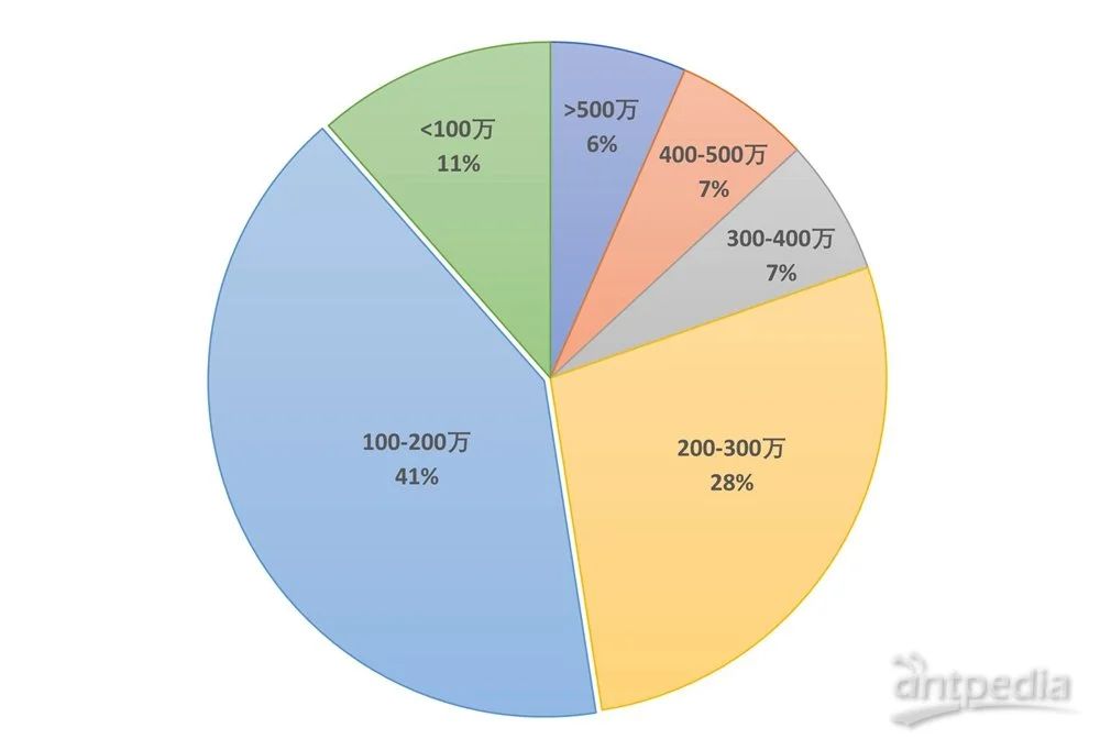 分子互作儀作為重要的生命科學(xué)儀器,其價(jià)格相對(duì)較高,基本設(shè)在百萬級(jí)。從本次統(tǒng)計(jì)來看,超過500萬中標(biāo)金額的儀器僅一個(gè)型號(hào),即思拓凡的Biacore 8K,200萬到500萬之間共計(jì)25臺(tái),8種型號(hào),包括思拓凡的Biacore 1S+、Biacore 1K;諾坦普的 Dianthus、Prometheus Panta、Monolith;賽多利斯的OCTET RH16、Octet R8、Octet R4,200萬以下共32臺(tái),共計(jì)12種型號(hào)。其中100萬到200萬是眾多單位的預(yù)算區(qū)間,共計(jì)25次中標(biāo)。