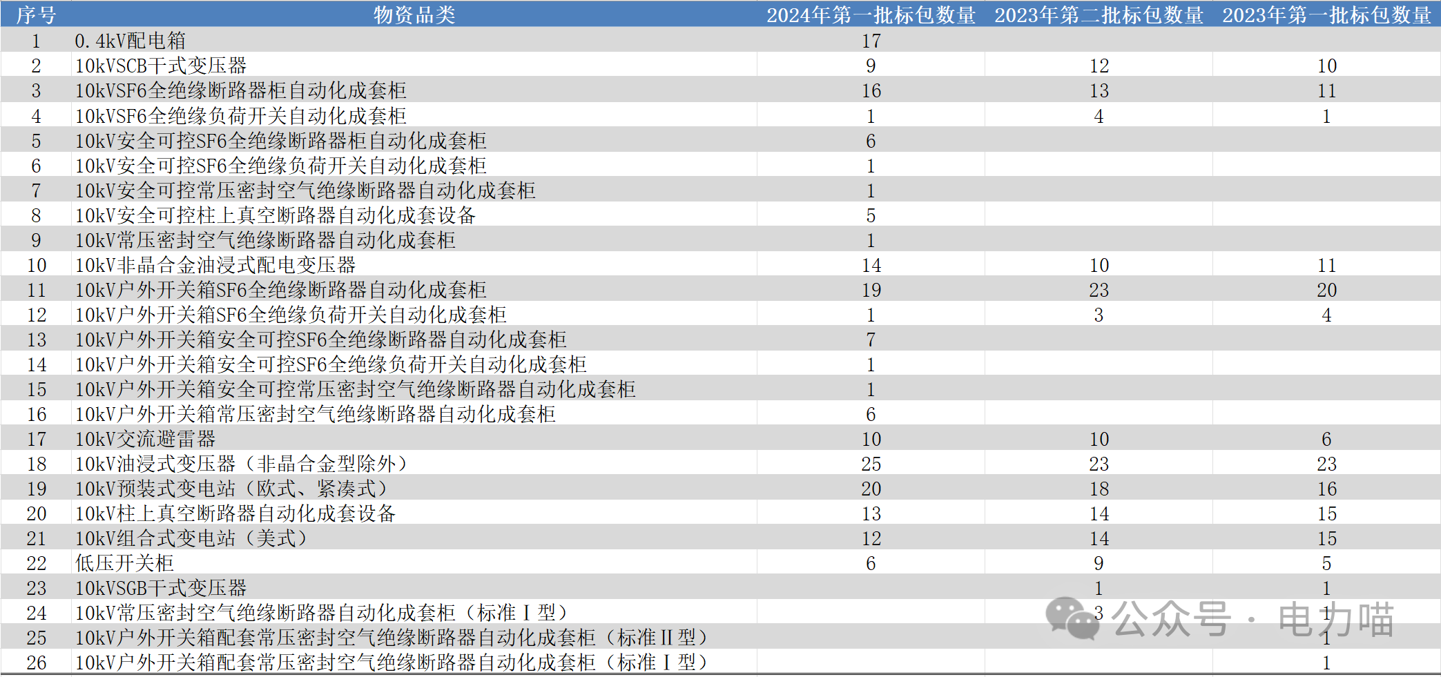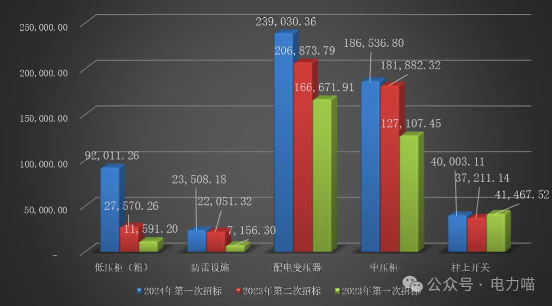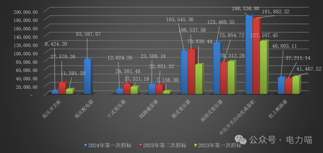 根據(jù)物資目錄分類規(guī)則,配電設(shè)備招標(biāo)的三級物資名稱包括低壓開關(guān)柜、低壓配電箱、干式變壓器、線路避雷器、箱式變壓器、油浸式變壓器、中壓開關(guān)自動化成套柜、柱上斷路器共八種。