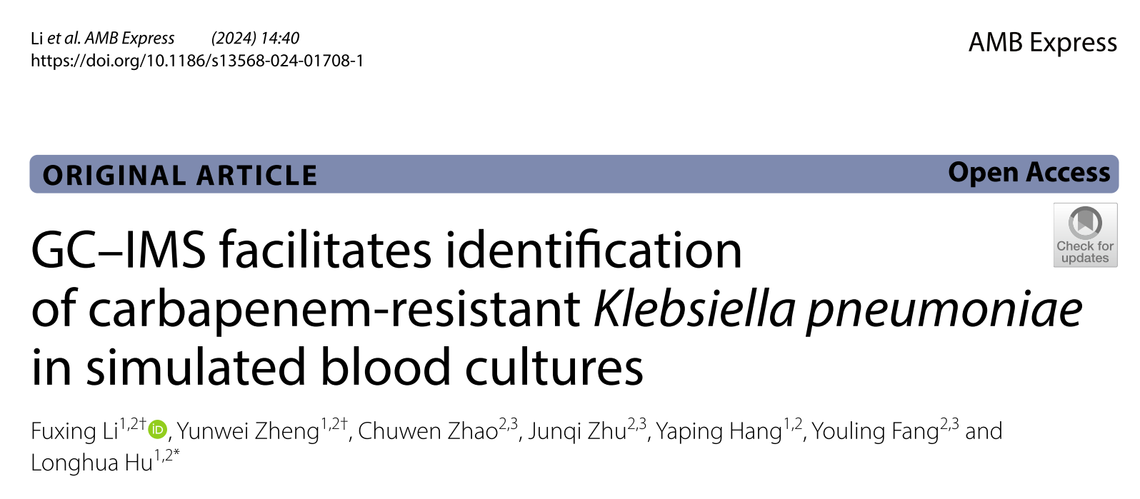 近日,南昌大學第二附屬醫(yī)院檢驗科胡龍華教授團隊基于氣相色譜-離子遷移譜聯(lián)用(GC-IMS)技術,通過測定CRKP和碳青霉烯類抗生素敏感的肺炎克雷伯菌(CSKP)在血培養(yǎng)過程中產生的代謝性揮發(fā)性有機化合物(VOCs)的特異性改變,實現(xiàn)了對CRKP的快速鑒定,其研究成果發(fā)表在應用微生物領域專業(yè)期刊AMB Express上(圖 1),為臨床微生物快速鑒定和藥敏試驗提供了一個新思路。