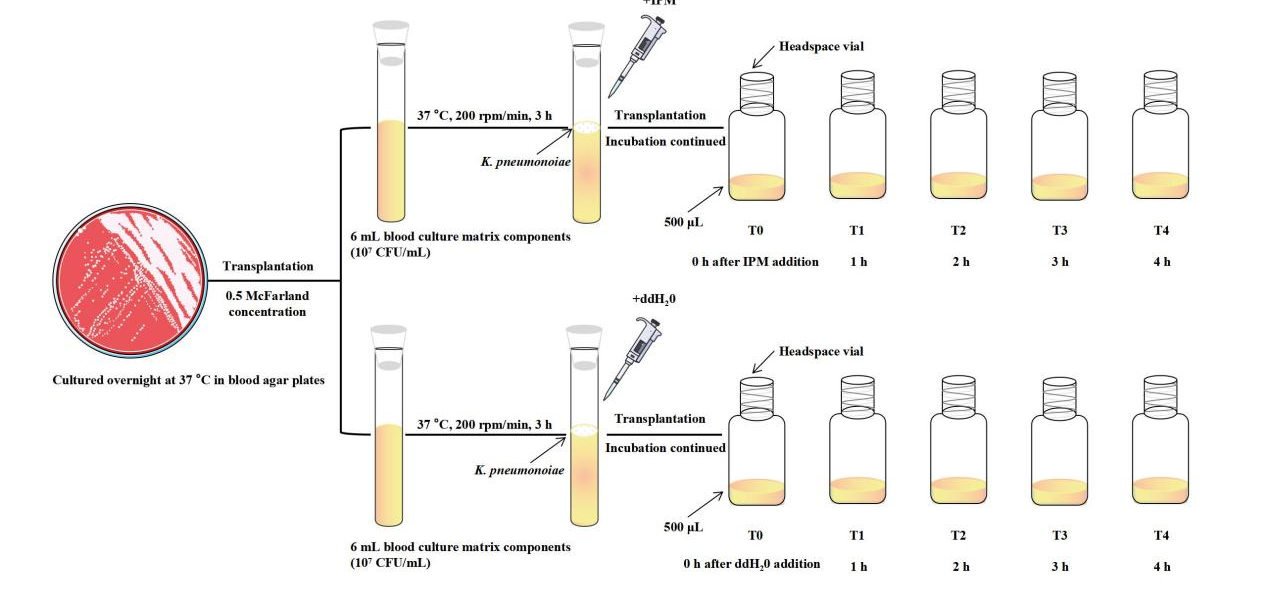 胡龍華教授團隊基于KP的4種標準菌株和69株臨床分離株展開研究,使用相同的血培養(yǎng)條件,所有菌株產生的VOCs分別在氣相色譜離子遷移譜聯(lián)用儀(FlavourSpec®)上檢測,為了觀察亞胺培南(IPM,一種碳青霉烯類抗生素,具有超廣譜、高效能的抗菌活性,對多種病原體所導致的中重度混合感染有明顯的抗菌作用)對CSKP和CRKP的作用,標準菌株在血培養(yǎng)3h后分別加入終濃度為0.25mg/mL的IPM,并設置4個連續(xù)的時間點分別對菌液進行VOCs的檢測。同時為了探索鑒定產碳青霉烯酶(CBPM)的KP,對CRKP各亞型加入CBPM抑制劑進行研究。相關的實驗流程圖詳見圖 2:
