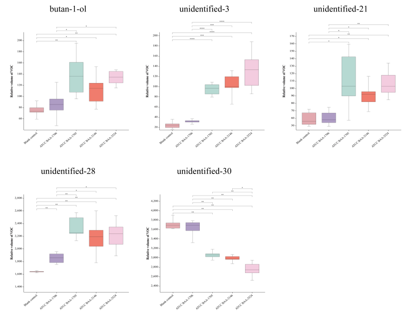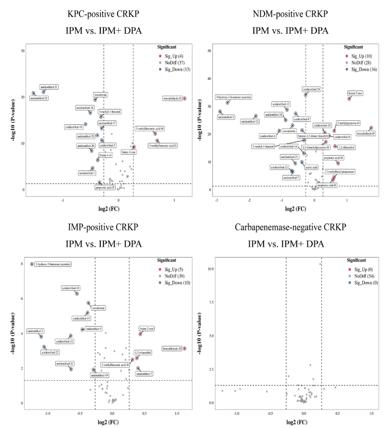 針對臨床分離株,通過VOCs的檢測鑒定產CBPM的CRKP,同標準菌株同樣的實驗操作方法,以加入B類酶抑制劑(DPA)為例,在T2時間點對VOCs進行檢測,結果發(fā)現(xiàn)在加入DPA后,部分VOCs出現(xiàn)了顯著的變化,包括KPC陽性株出現(xiàn)了4種VOC的升高和8種VOCs的降低;NDM陽性株出現(xiàn)了8種VOCs的升高和11種VOCs的降低;相比于NDM陽性株,IPM陽性株出現(xiàn)了1,2-乙二醇的升高和3-羥基-2-丁酮以及4種未定性VOCs的降低(圖 9)。