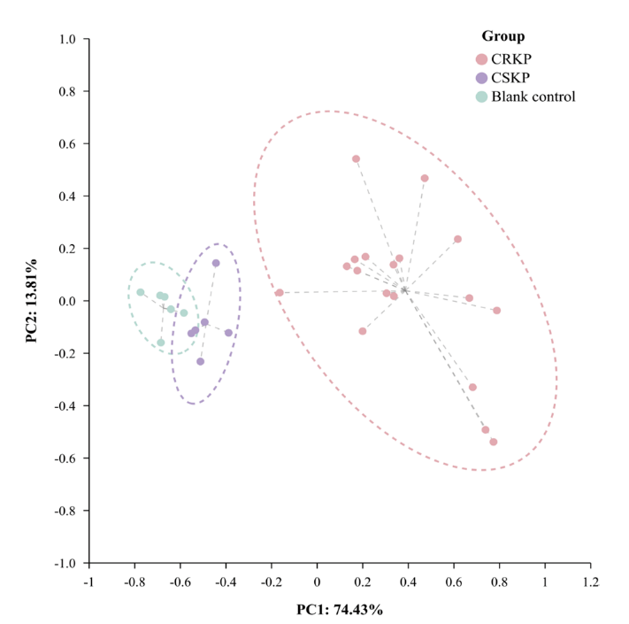 在CRKP和CSKP的鑒定中,在不添加IPM的條件下,通過檢測標準菌株的VOCs,發(fā)現(xiàn)5種VOCs在兩個組別種存在顯著性差異,相對于CSKP,CRKP的未定性物質3#、21#、28#和正丁醇含量增加,而未定性物質30#含量減少(圖 3)。之后主成分分析顯示上述5種VOCs可有效地區(qū)分CSKP和CRKP(圖 4),但這一差異會隨著時間推移而消失。