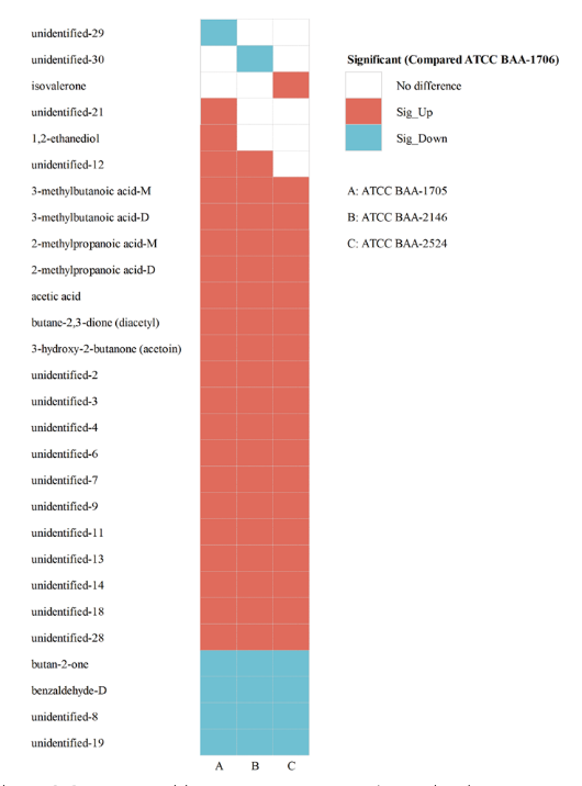 圖 6 ATCC BAA-1705菌株加入CBPM抑制劑后的VOCs變化 圖 7 加入CBPM抑制劑后的標準菌株VOCs的PCA圖