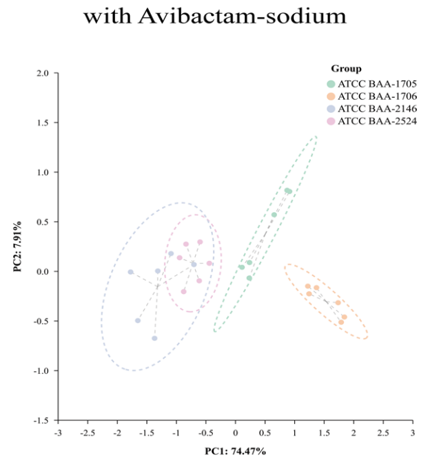 在CRKP中,最為常見的是產CBPM的KP,為研究VOCs的檢測是否有助于鑒定產CBPM的CRKP,在標準菌株中加入IPM的同時,分別設置加入/不加入CBPM抑制劑進行對照研究,并在后續(xù)的時間點觀察VOCs的變化情況。以產A類碳青霉烯酶KP為例,結果表明,ATCC BAA-1705菌株在加入CBPM抑制劑后,和未加入CBPM抑制劑相比,出現(xiàn)了5種VOCs(苯甲醛二聚體、2,5-二甲基吡嗪二聚體、2-甲基吡嗪二聚體、丁酮和未定性VOCs15#)含量的上升以及13種VOCs(2-甲基丙烯酸單體和二聚體、丙酸單體和二聚體、乙酸、3-羥基-2-丁酮和7種未定性物質)含量的下降(圖 6)。通過PCA分析顯示CBPM抑制劑的加入可鑒定ATCC BAA-1705為A類產CBPM的CRKP(圖 7)。與之相似的是,加入CBMP抑制劑后,產B類碳青霉烯酶KP(ATCC BAA-2146)的VOCs發(fā)生了特異性改變。