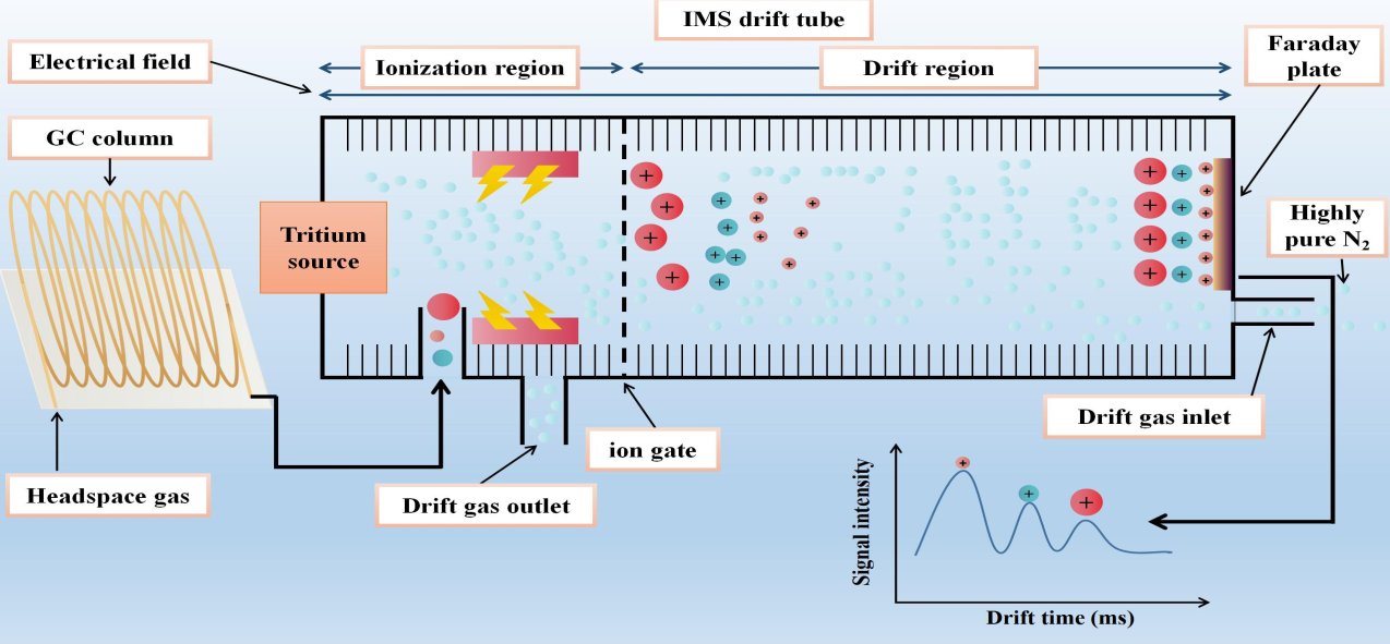 氣相色譜-離子遷移譜聯(lián)用(GC-IMS)技術是將氣相色譜的高效分離與離子遷移譜的痕量快速分析優(yōu)勢相結合,經(jīng)過二次分離后得到保留時間、漂移時間和信號強度的三維譜圖,實現(xiàn)對各類樣品中VOCs的痕量檢測,目前廣泛應用于風味、泛環(huán)境和醫(yī)學檢測領域的研究。設備具有高靈敏度、適應性強、操作簡便、快速分析的特點,相關的檢測流程示意圖詳見圖 10,本研究對于KP產生的VOCs的檢測操作均在氣相色譜離子遷移譜聯(lián)用儀(FlavourSpec®)上完成。