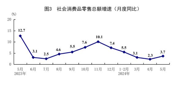 5月份,社會消費品零售總額39211億元,同比增長3.7%,比上月加快1.4個百分點;環比增長0.51%。按經營單位所在地分,城鎮消費品零售額34111億元,同比增長3.7%;鄉村消費品零售額5100億元,增長4.1%。按消費類型分,商品零售34937億元,增長3.6%;餐飲收入4274億元,增長5.0%。部分升級類商品銷售增長較快,限額以上單位體育、娛樂用品類,化妝品類,通訊器材類,家用電器和音像器材類商品零售額分別增長20.2%、18.7%、16.6%和12.9%。1-5月份,社會消費品零售總額195237億元,同比增長4.1%。全國網上零售額57669億元,同比增長12.4%。其中,實物商品網上零售額48280億元,增長11.5%,占社會消費品零售總額的比重為24.7%。1-5月份,服務零售額同比增長7.9%。