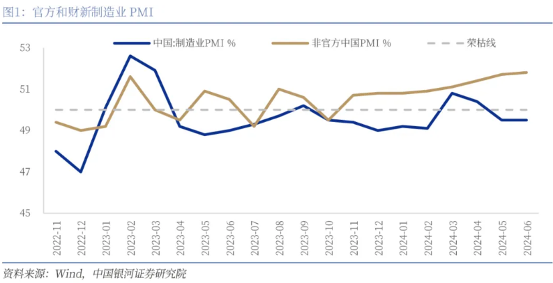 財(cái)新PMI再度上行,與中采PMI背離繼續(xù)走闊。7月1日,財(cái)新發(fā)布6月PMI錄得51.8%,環(huán)比上漲0.1pct,在擴(kuò)張區(qū)間再次上行。財(cái)新PMI在2023年11月以來(lái)持續(xù)強(qiáng)勢(shì),連續(xù)8個(gè)月保持?jǐn)U張。但與此同時(shí)官方制造業(yè)PMI和財(cái)新PMI卻持續(xù)背離,這8個(gè)月期間官方制造業(yè)PMI平均為49.61%,而財(cái)新PMI均值為51.15%,且背離幅度有走闊趨勢(shì)。