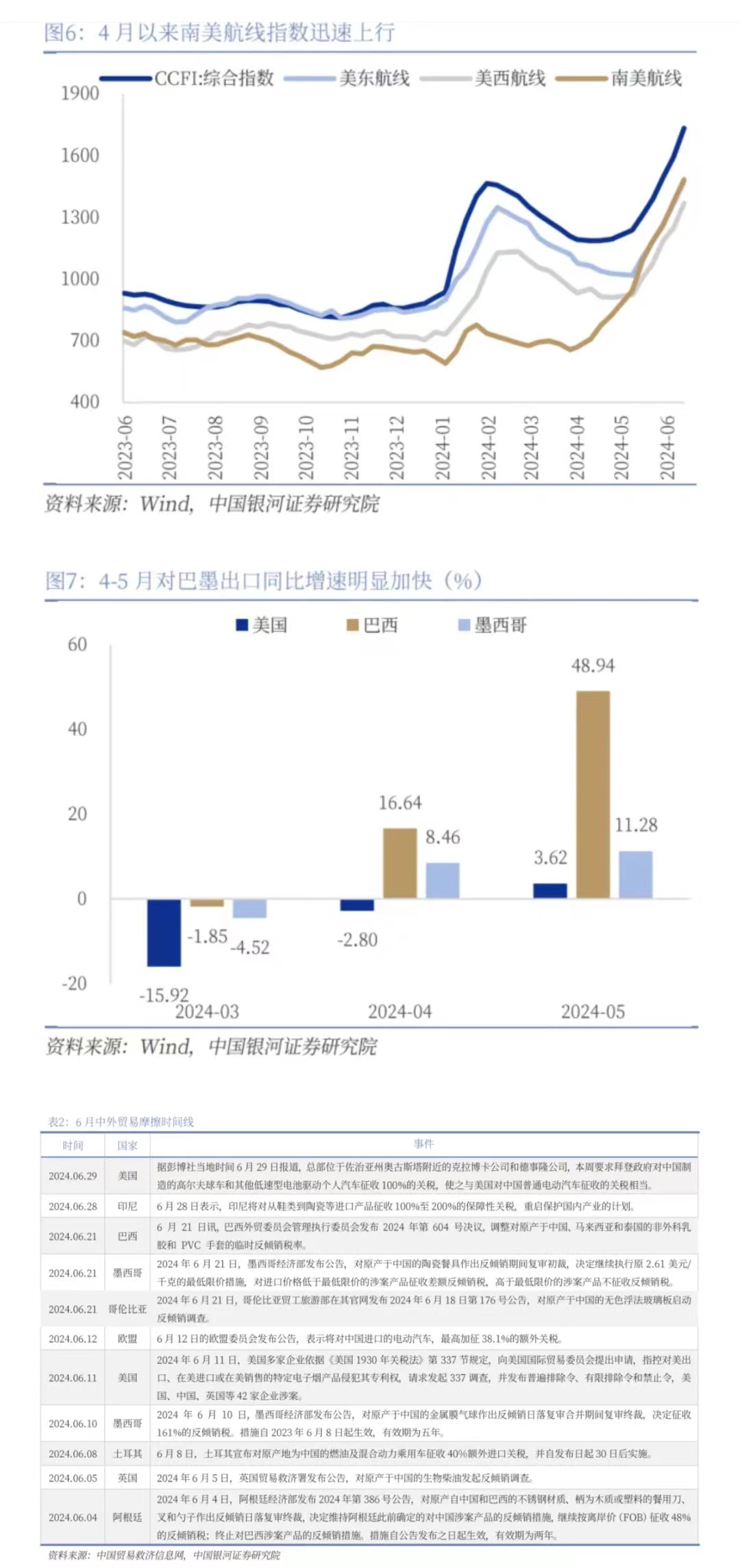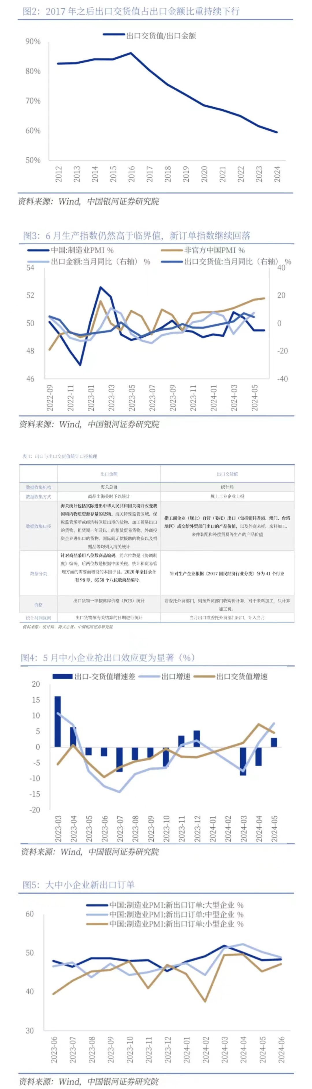 受制于進(jìn)口國(guó)貿(mào)易政策的變化和地緣政治的潛在影響,企業(yè)出現(xiàn)搶出口行為。5月14日美方發(fā)布對(duì)華加征301關(guān)稅四年期復(fù)審結(jié)果,進(jìn)一步提高對(duì)自華進(jìn)口的電動(dòng)汽車等約180億美元商品加征關(guān)稅。6月以來(lái)歐盟、土耳其、巴西、印尼等也陸續(xù)宣布將對(duì)我國(guó)部分出口商品加征關(guān)稅。受此因素驅(qū)動(dòng),企業(yè)出現(xiàn)“搶出口”行為以規(guī)避高額關(guān)稅,帶動(dòng)5月出口增速同比上行至7.6%。從航線運(yùn)價(jià)指數(shù)來(lái)看,5月份以來(lái)CCFI指數(shù)迅速上漲,美東和美西航線分別環(huán)比上漲23.5%和30.4%,南美航線上漲53.4%。從對(duì)美國(guó)、墨西哥、巴西三地的出口增速來(lái)看,5月份我國(guó)對(duì)其三者出口同比分別增長(zhǎng)3.6%、11.3%和48.9%,對(duì)墨西哥尤其是巴西出口增速的高增長(zhǎng)或指向部分商品借道巴墨等地以滿足對(duì)美出口需求。對(duì)外貿(mào)更加敏感的中小企業(yè)具有更顯著的搶出口效應(yīng),5月出口增速改善幅度顯著好于出口交貨值增速。