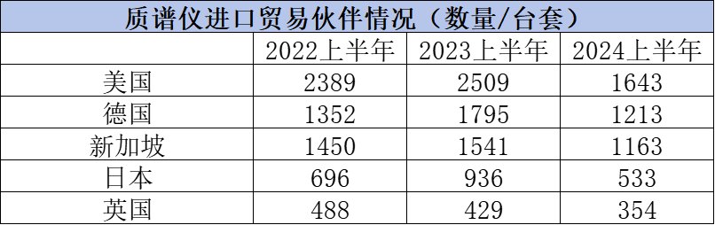 數(shù)據(jù)顯示2022年上半年、2023年上半年、2024年上半年,質(zhì)譜進(jìn)口貿(mào)易地區(qū)排名前五的均為美國(guó)、德國(guó)、新加坡、日本、英國(guó)。僅僅從2024年上半年進(jìn)口數(shù)量來(lái)看,美國(guó)1643臺(tái)套,占比29.5%,德國(guó)1213臺(tái)套,占比21.8%,新加坡1163臺(tái)套,占比20.9%。從上述三個(gè)國(guó)家進(jìn)口數(shù)量總占比72.2%。