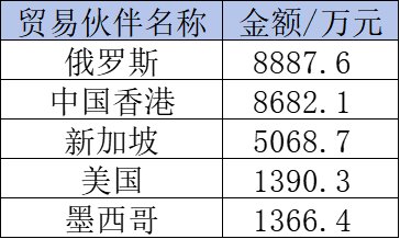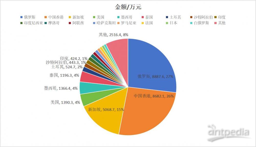 出口質(zhì)譜儀金額3.3億元,排名前五的國(guó)家/地區(qū),俄羅斯8887.6萬(wàn)元,銷往中國(guó)香港8682.1萬(wàn)元,新加坡5068.7萬(wàn)元,美國(guó)1390.3萬(wàn)元,墨西哥1366.4萬(wàn)元。