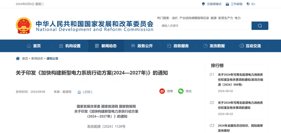 國家發展改革委、國家能源局、國家數據局86日聯合發布《加快構建新型電力系統行動方案(2024—2027年)》。