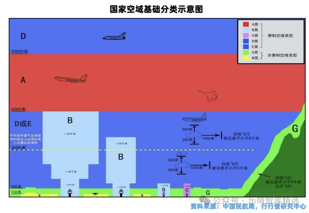 202312月民航局發布的《國家空域基礎分類方法》中,將空域劃分為A、BC、D、EG、W7類,其中,AB、C、DE類為管制空域,GW類為非管制空域。