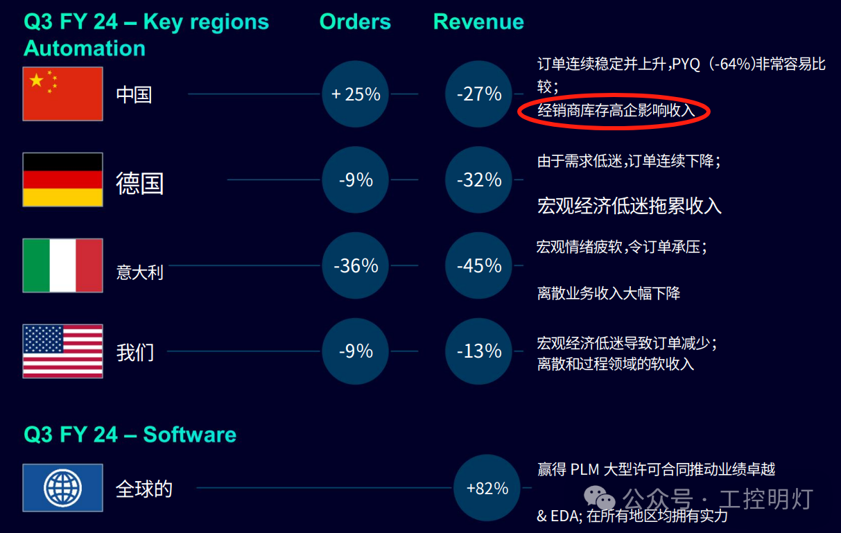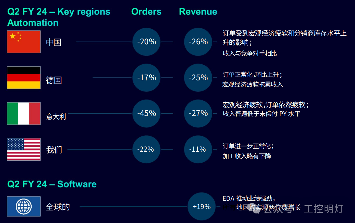 與之前的假設(shè)相反,Digital Industries 自動(dòng)化業(yè)務(wù)的客h去庫(kù)存化可能會(huì)持續(xù)到今年下半年,尤其是在中國(guó)。對(duì)于 2024 財(cái)年下半年,Digital Industries 假設(shè)其⾃動(dòng)化業(yè)務(wù)的需求將⽐本財(cái) 年上半年有所回升,并預(yù)計(jì)其軟件業(yè)務(wù)將獲得⼤量合同。