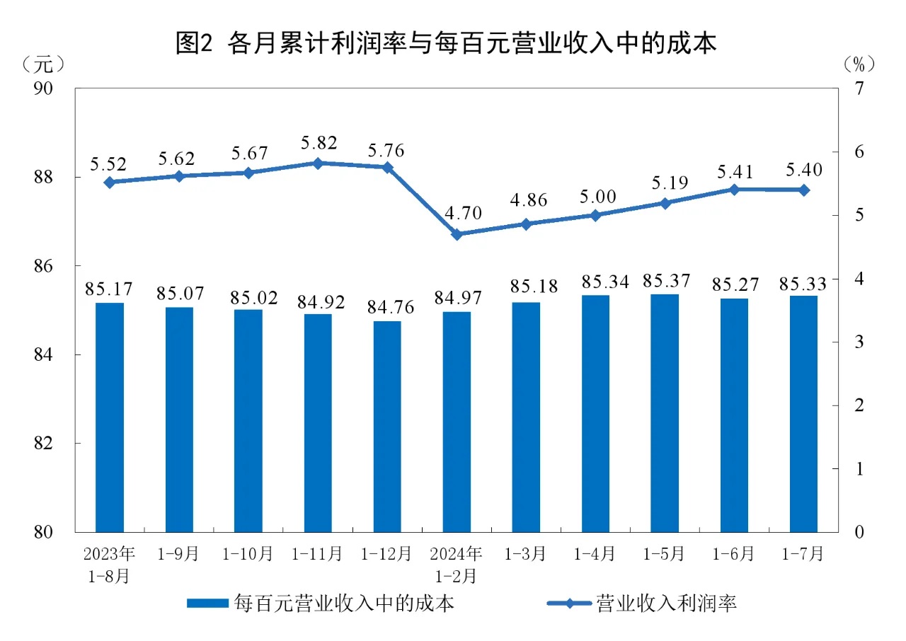 1—7月份,規(guī)模以上工業(yè)企業(yè)每百元營業(yè)收入中的成本為85.33元,同比增加0.09元;每百元營業(yè)收入中的費(fèi)用為8.41元,同比持平。
