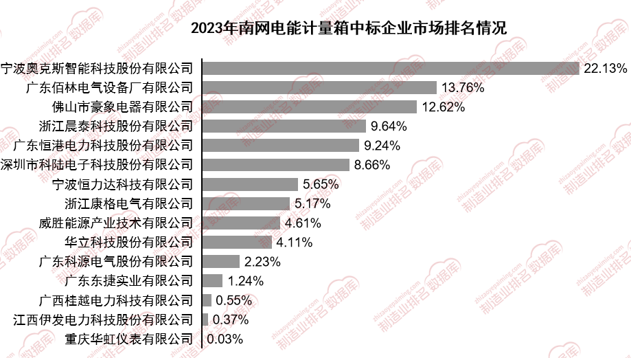 2023年度,南網(wǎng)范圍內(nèi)電能計(jì)量箱產(chǎn)品的招標(biāo)市場(chǎng)總體規(guī)模約為5.4億元,共有15家企業(yè)中標(biāo)。在這些企業(yè)中,寧波奧克斯智能科技股份有限公司中標(biāo)金額最大,約為1.2億元元,占比約22.1%。其次,是廣東佰林電氣設(shè)備廠有限公司和佛山市豪象電器有限公司,中標(biāo)金額分別為74.6百萬(wàn)元和68.4百萬(wàn)元,占比分別為13.8%和12.6%。整體來(lái)看,南網(wǎng)電能計(jì)量箱產(chǎn)品市場(chǎng)的供應(yīng)商整體較為集中。