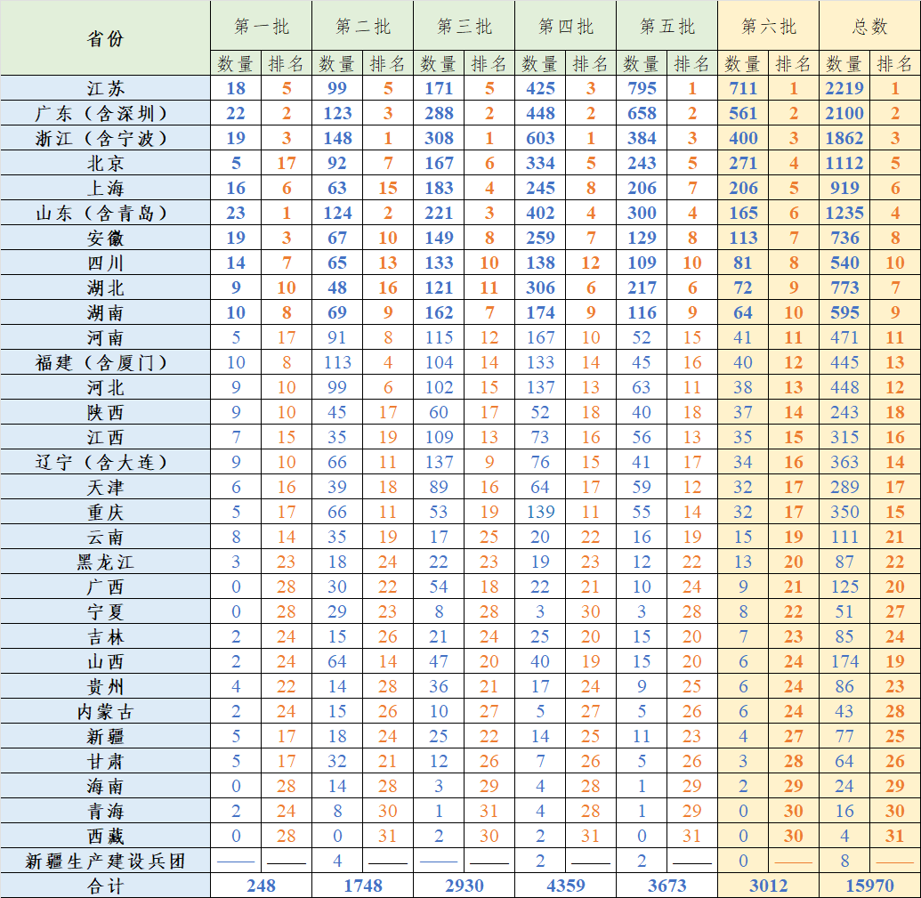 第六批“小巨人”企業公示數量3012家,比第五批的3673家減少650余家,大部分省市立項數量較前批次也都出現了不同程度的下降(參見圖1)。近年來,我國小巨人培育遴選工作呈現以下特征: