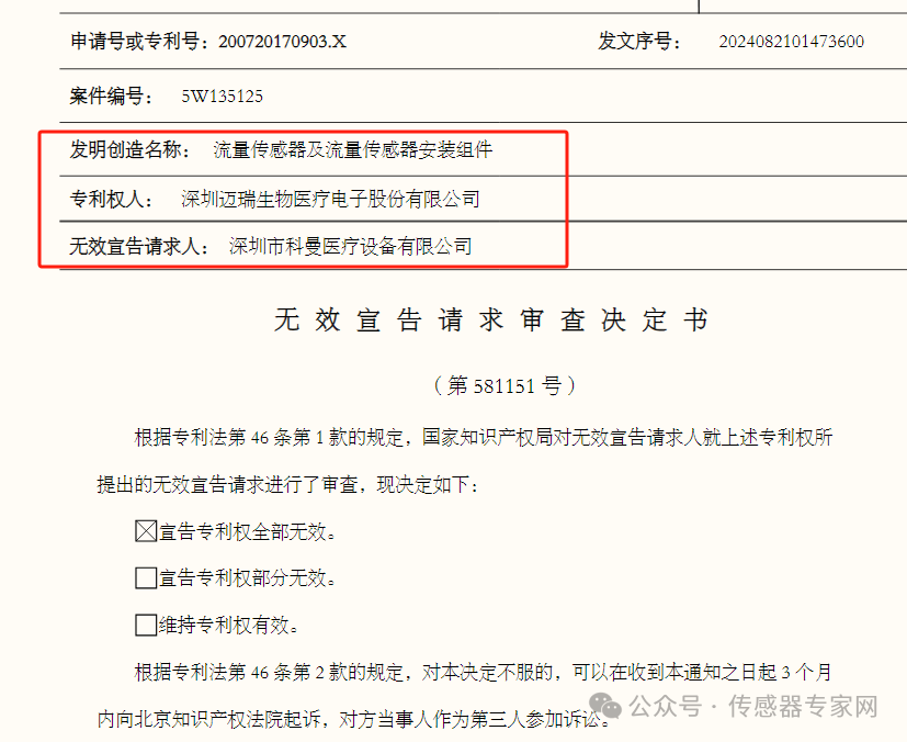 8月26日,國(guó)家知識(shí)產(chǎn)權(quán)局發(fā)布第581151號(hào)《無效宣告請(qǐng)求審查決定書》,宣布專利號(hào)為“ZL200720170903.X”的發(fā)明創(chuàng)造專利“流量傳感器及流量傳感器安裝組件”專利權(quán)全部無效。