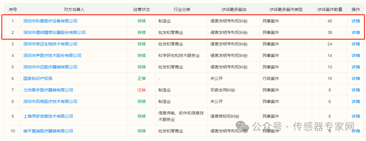 此外,另一家國(guó)產(chǎn)醫(yī)療儀器設(shè)備商理邦儀器,以38個(gè)案件數(shù)量,僅次于科曼醫(yī)療,同樣是邁瑞醫(yī)療主要法律糾紛對(duì)象。