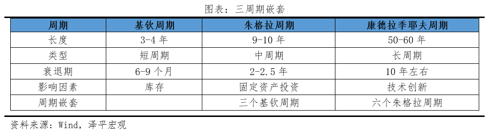 超長波的創新周期(又稱康德拉耶夫周期)是由創新活動的集聚發生所致,50-70年左右;瑞·達利奧提出的超長波的債務周期是居民借貸調整而引導的經濟周期,50-75年左右;長波的房地產周期(又稱庫茲涅茨周期)主要是住房建設活動導致的,20-40年左右;中長波的設備投資/產能周期(又稱朱格拉周期)揭示的是產業在生產設備和基礎設施的循環投資活動,6-11年左右;中短波的庫存周期(又稱基欽周期)揭示的是工商業部門的存貨調整周期,3-4年左右。