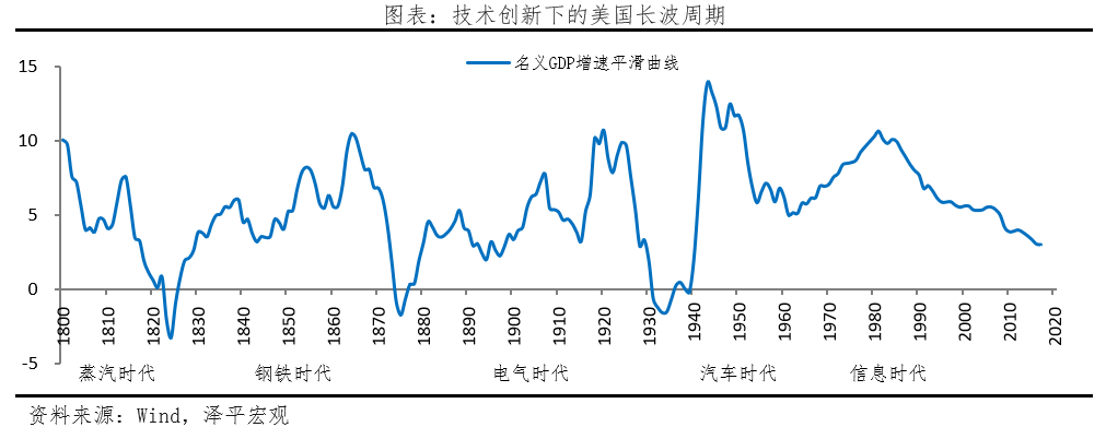 從康波周期來看,世界經濟當前正處在信息技術主導的第五輪周期末期和AI主導的第6輪周期的起步階段。前五次創新周期的主導創新技術分別為:紡織工業和蒸汽機技術(63年),鋼鐵和鐵路技術(47年),電氣和重化工業(56年),汽車和電子計算機(43年),信息技術(34年)。隨著科技迭代速度加快,創新周期的持續時長也在逐步縮短。上世紀90年代以來,信息技術的創新推動了第五次創新周期的繁榮。當技術創新影響力逐漸衰退,高價格得不到盈利支持時,互聯網泡沫破滅,2008年次貸危機標志著本輪創新周期繁榮期結束、衰退期開始。而2020年以來,以無人駕駛、人工智能、物聯網、區塊鏈等為首的數字化革命標志著第六輪創新周期正在起步。