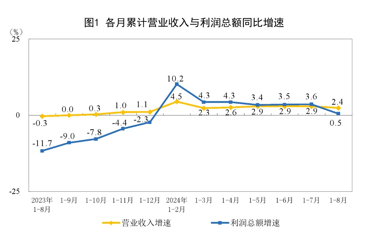 1—8月份,全國規(guī)模以上工業(yè)企業(yè)實現(xiàn)利潤總額46527.3億元,同比增長0.5%(按可比口徑計算,詳見附注二)。