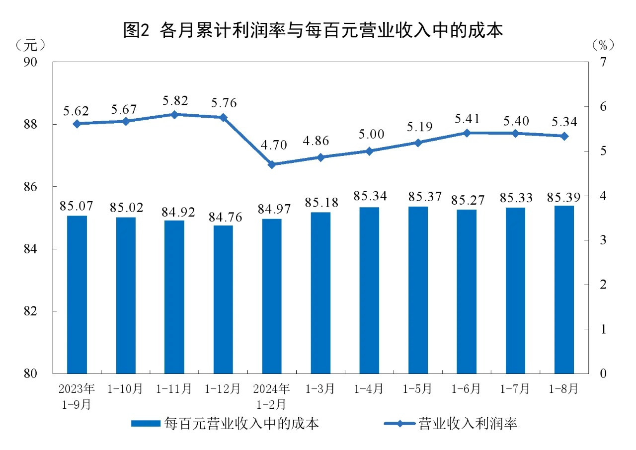1—8月份,規(guī)模以上工業(yè)企業(yè)實現(xiàn)營業(yè)收入87.10萬億元,同比增長2.4%;發(fā)生營業(yè)成本74.38萬億元,增長2.6%;營業(yè)收入利潤率為5.34%,同比下降0.10個百分點。