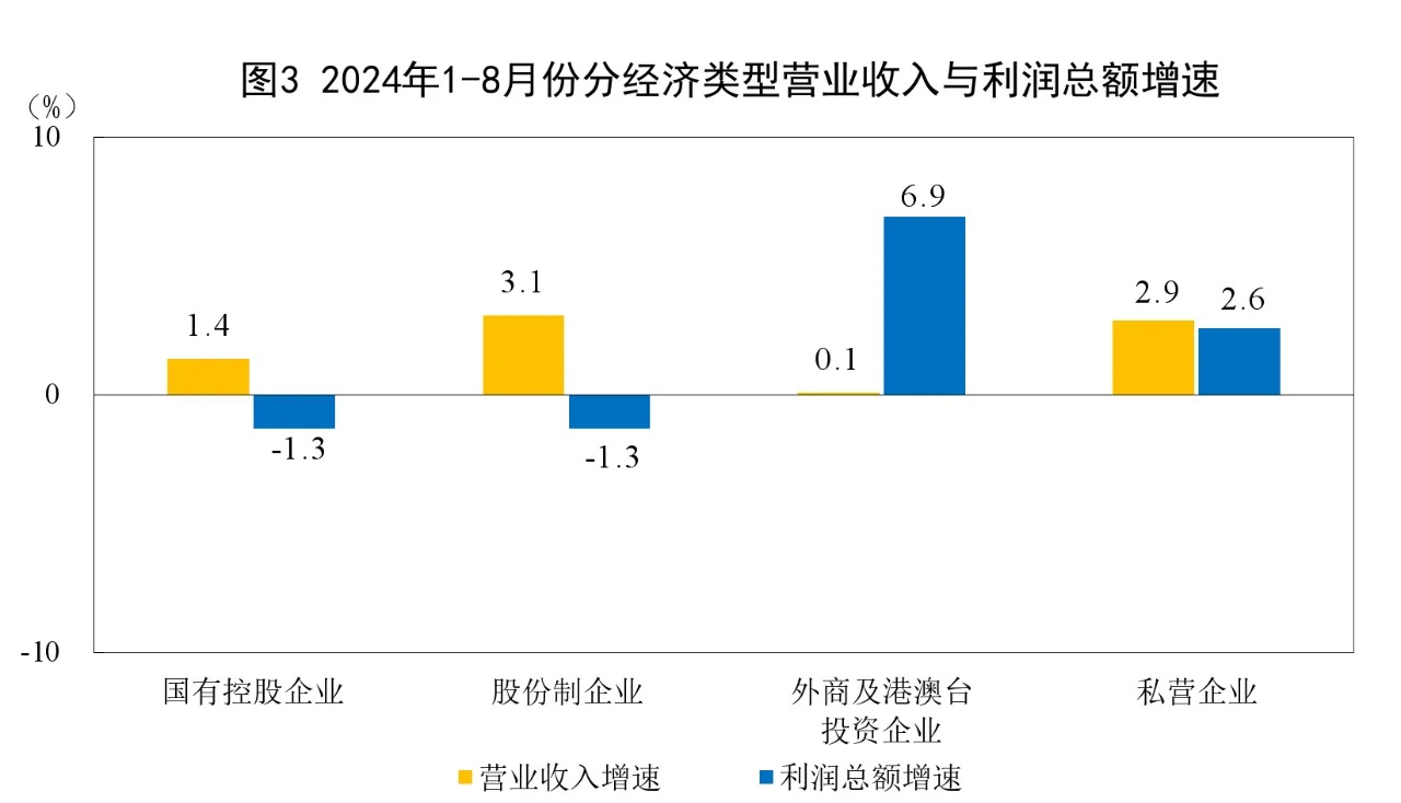 1—8月份,規(guī)模以上工業(yè)企業(yè)中,國有控股企業(yè)實現(xiàn)利潤總額15490.6億元,同比下降1.3%;股份制企業(yè)實現(xiàn)利潤總額34430.3億元,下降1.3%;外商及港澳臺投資企業(yè)實現(xiàn)利潤總額11777.0億元,增長6.9%;私營企業(yè)實現(xiàn)利潤總額12648.3億元,增長2.6%。