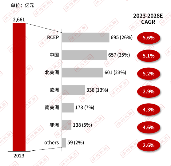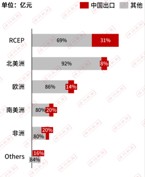 2023年中國變壓器出口業(yè)績占比分布為RCEP57.0%、歐洲12.3%、北美洲12.0%、南美洲9.0%、非洲7.2%、其他2.5%。在全球各地區(qū)中,中國出口的變壓器產品在RCEP地區(qū)中占比最高,占比為31%,南美、非洲地區(qū)占比為20%。