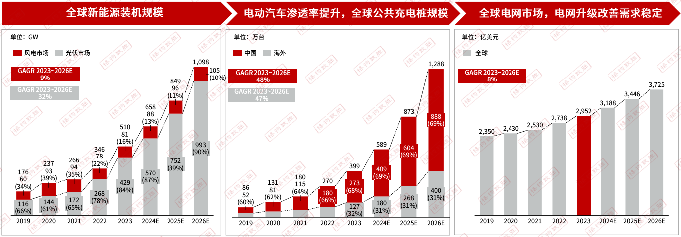 隨著光伏技術進步和產業(yè)規(guī)模化推動,光伏成本持續(xù)降低,世界光伏新增裝機量復合增長率達到32%。隨著新能源汽車行業(yè)的發(fā)展,汽車行業(yè)迎來了較高的增長期,與之對應的充電樁規(guī)模也隨之高速增長,全球公共充電樁市場規(guī)模以48%的復合增長率快速增長。全球電網投資穩(wěn)定增長,預計將以8%的復合增長率增長,電網升級改善需求穩(wěn)定。