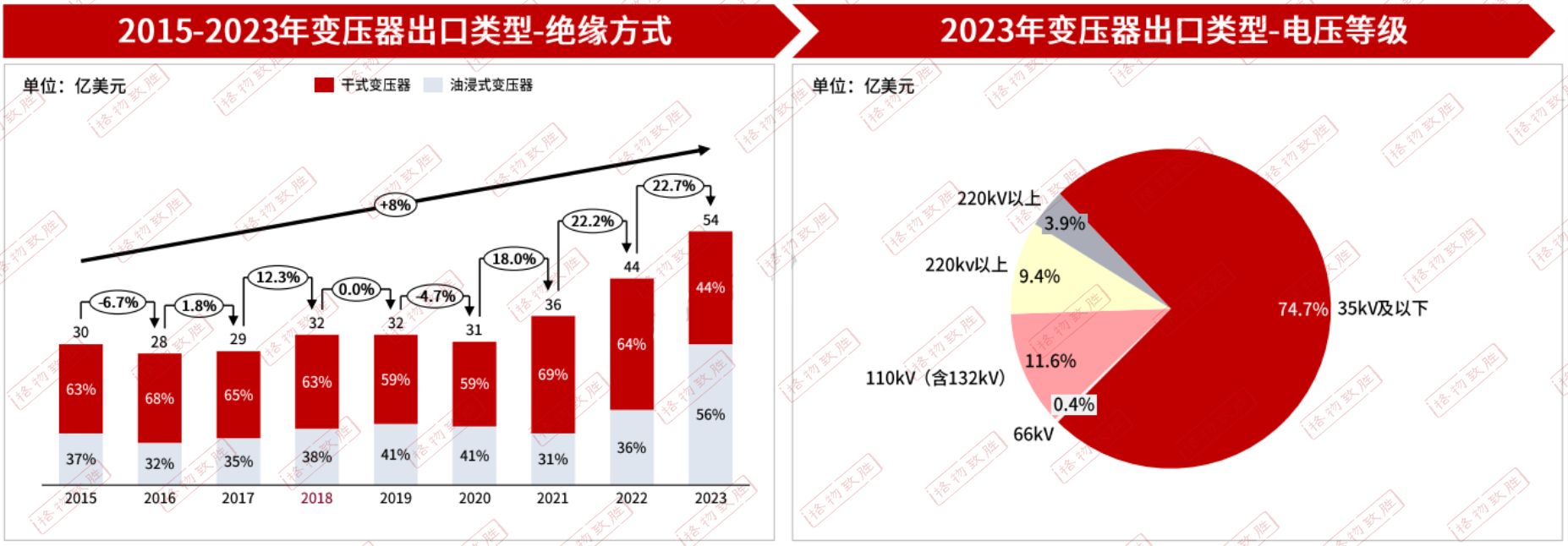 從2015-2023年變壓器出口情況來看,主要以干式變壓器為主,由于干式變壓器相對油浸式變壓器抗短路能力強且體積小、運行效率高的產品特性,干式變壓器價格高于浸式變壓器,因此市場占比較大。2023年變壓器出口情況來看,35kV及以下電壓等級變壓器使用行業(yè)更為廣泛,因此占整體電壓等級的約75%,66kV有少量出口,主要用于海上風電等新能源行業(yè),未來市場潛力較大。