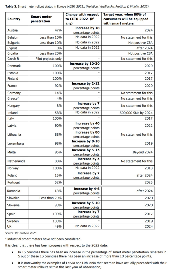 強調(diào)一下,上述智能電表的推出計劃是基于各成員國進行積極的成本效益分析(CBA)后的結(jié)果。這就解釋了為什么各成員國的情況各不相同,因為同等的 CBA 要么沒有在同一時間轉(zhuǎn)為正值,要么根本不是正值。根據(jù)最新數(shù)據(jù),21個成員國已決定推出智能電表,這意味著積極的CBA。但是,有 2 個成員國仍未完成 CBA 或尚未公布其結(jié)果,即:保加利亞、匈牙利。另一方面,有 4 個成員國的 CBA 為負數(shù)或不確定,即:比利時、捷克共和國、德國、斯洛伐克。
